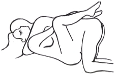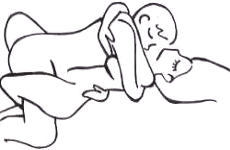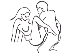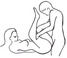 仰向けになった女の両足をあげさせ、男はその両膝の外側に手を当てて開き、挿入する。