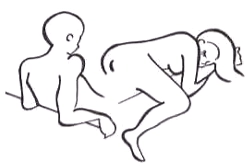 〆こみ錦の変形体位。男が壁などにもたれかかり、女を後ろ向きに座らせ、挿入。