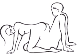 女は男の両足をまたいで後ろ向きに座り、挿入後、足を伸ばしていく。