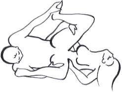 女が大きく足を開き、仰向けに寝ているところに、男がその下に腰をもぐりこませて挿入。